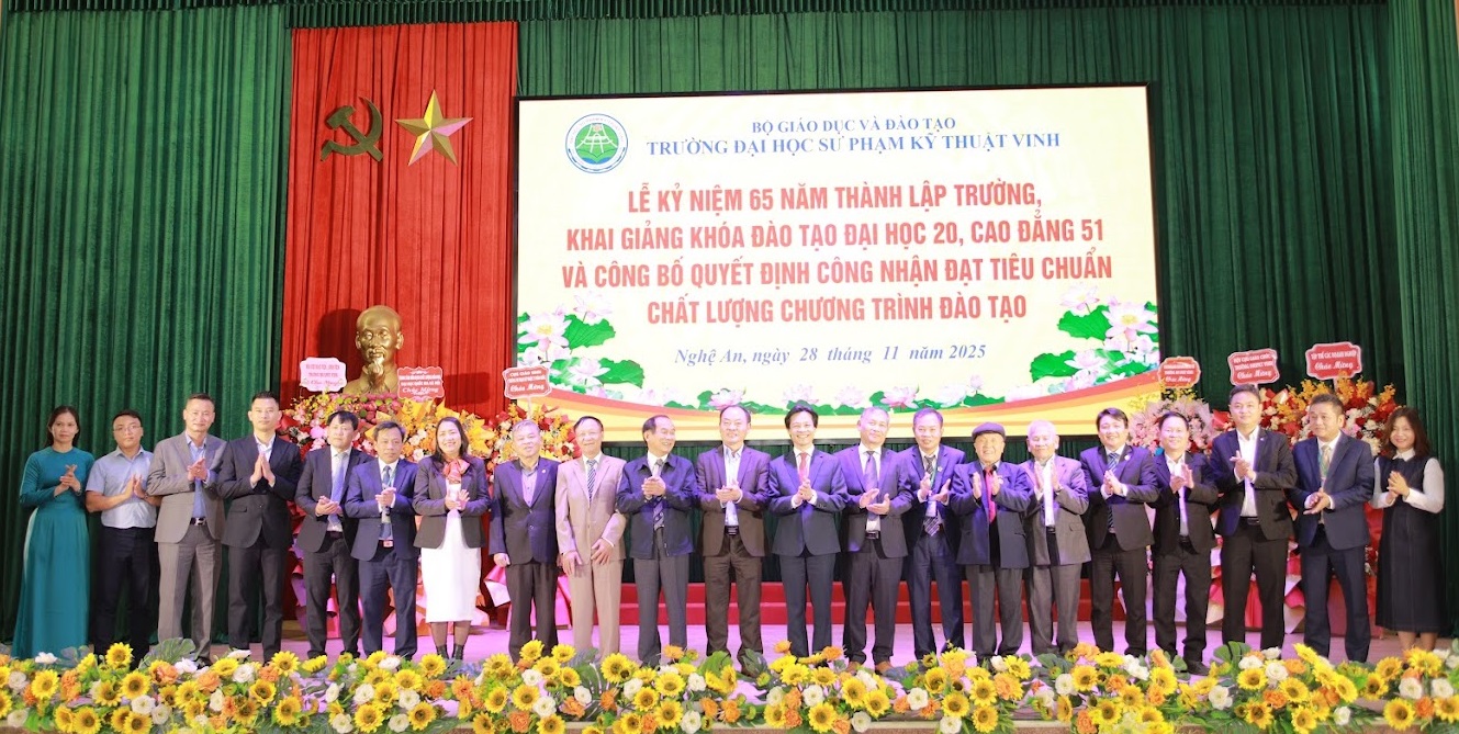 Sáng 28/11, Trường Đại học Sư phạm Kỹ thuật Vinh trang trọng tổ chức Lễ Kỷ niệm 65 năm thành lập trường, khai giảng khóa đào tạo Đại học K20, Cao đẳng K51 và công bố quyết định công nhận đạt tiêu chuẩn chất lượng chương trình đào tạo.