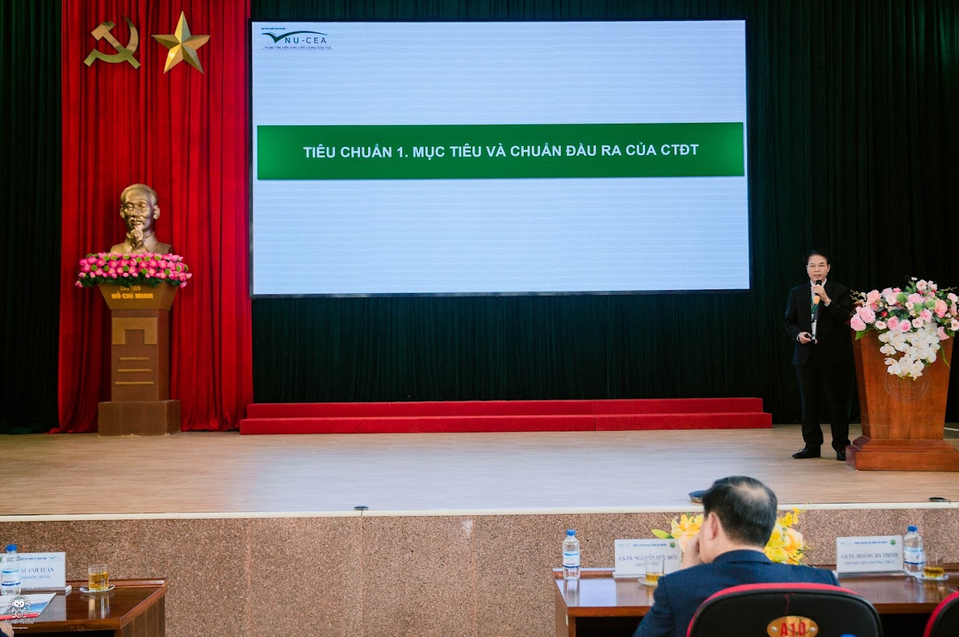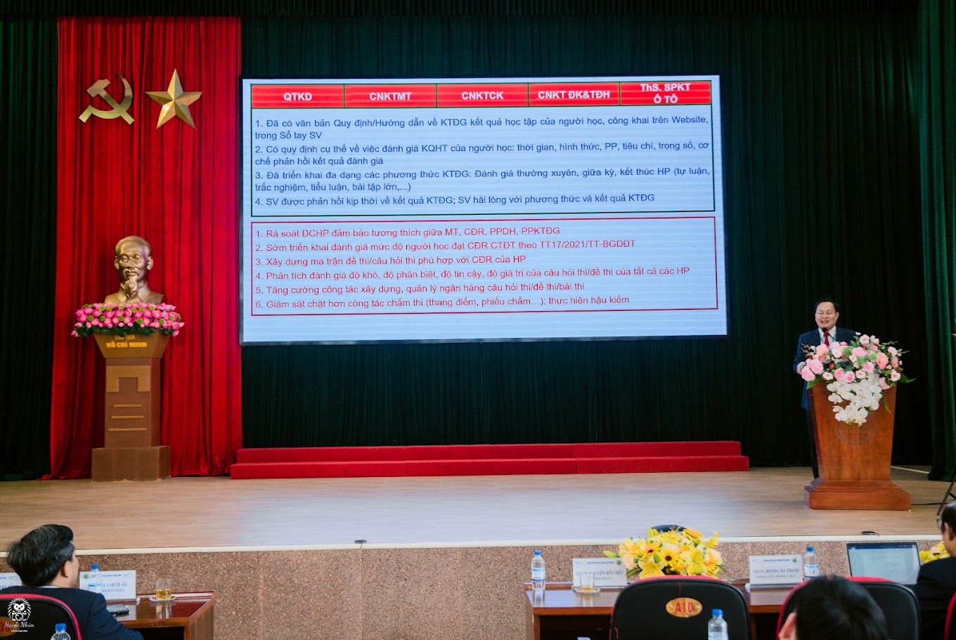 Vê phía Nhà trường có TS. Thái Anh Tuấn - Bí thư Đảng ủy, Chủ tịch Hội đồng Trường, TS.Phạm Hữu Truyền – Hiệu trưởng Nhà trường, PGS.TS Cao Danh Chính - Phó Hiệu trưởng; TS. Thái Hữu Nguyên - Phó Hiệu trưởng cung các đồng chí là trưởng phó đơn vị trực thuộc, các giảng viên và các em sinh viên tiêu biểu của 5 ngành đào tạo được đánh giá.